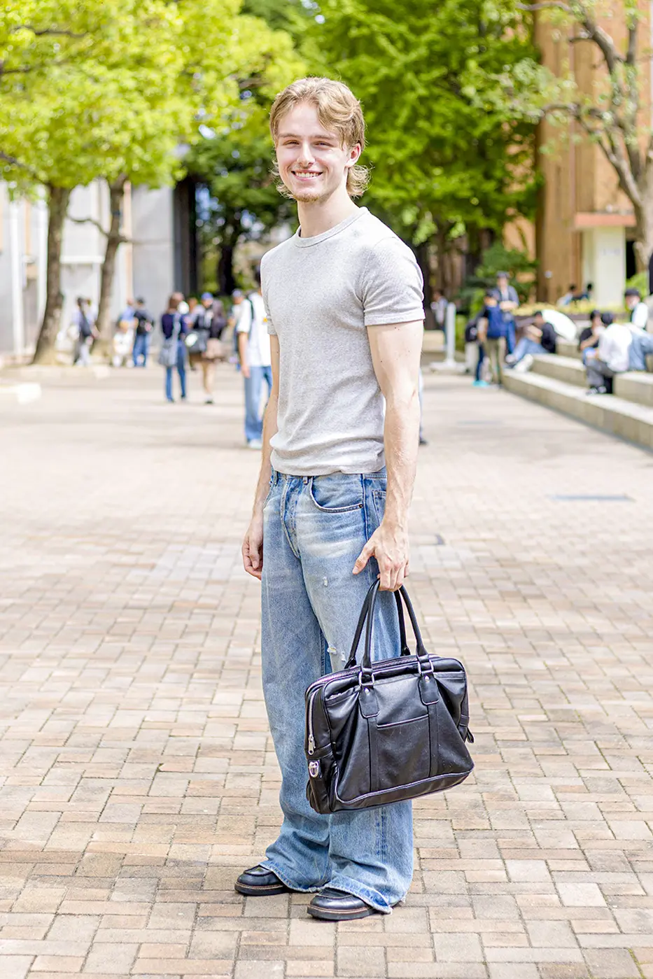 [ mat ] ・今日のポイント: パンツ/Acne Studios/¥80,000 ・近大生になって良かったと感じる瞬間は?「自分の国と異なる視点を発見できたとき」 ・あなたの夢は? 「世界の国を巡る」
